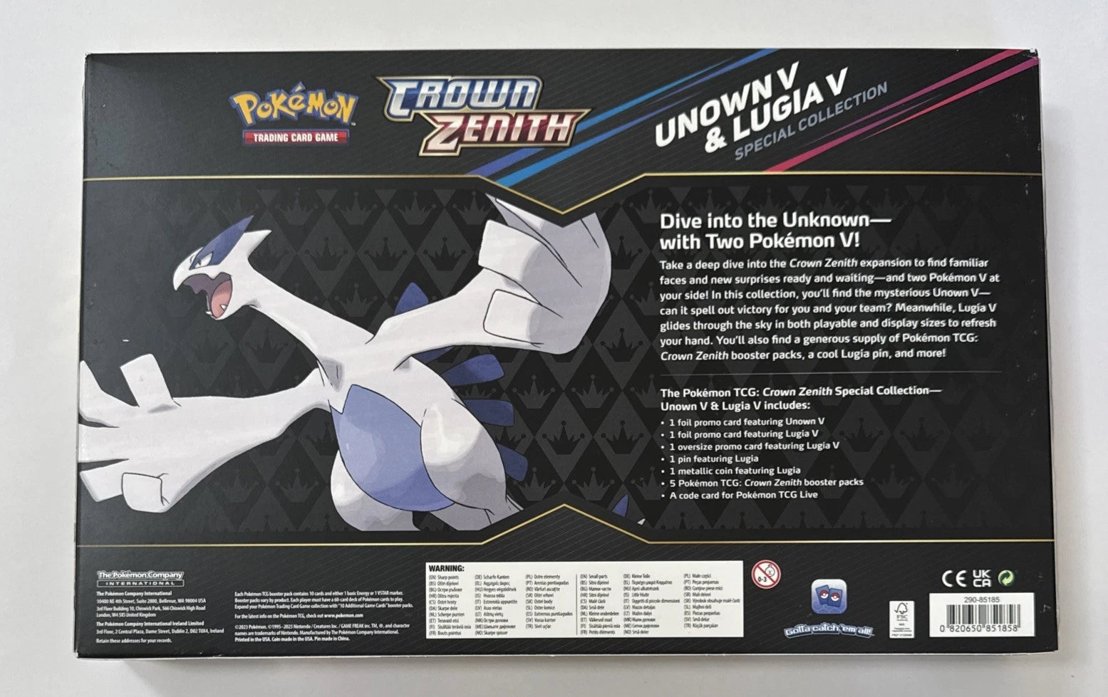 The Pokemon TCG Crown Zenith Lugia V Unown V Special Collection Box is an official Pokemon Trading Card Game product featuring exclusive promo cards and booster packs from the Crown Zenith expansion.